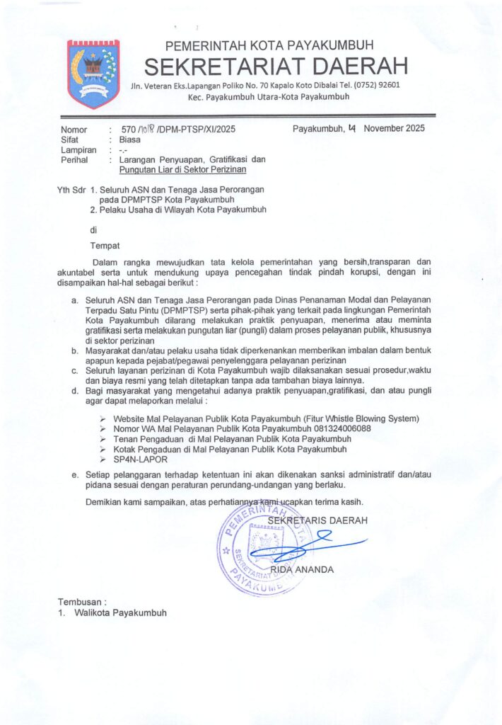 Pemerintah Kota Payakumbuh menegaskan komitmennya dalam mewujudkan pelayanan publik yang bersih, transparan, dan bebas dari praktik KKN, khususnya di sektor perizinan.