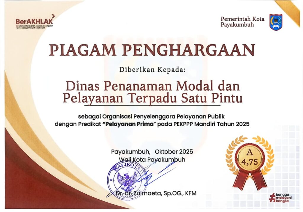 Alhamdulillah, Dinas Penanaman Modal dan Pelayanan Terpadu Satu Pintu (DPMPTSP) Kota Payakumbuh berhasil meraih Piagam Penghargaan sebagai Organisasi dengan Predikat “Pelayanan Prima” pada Penilaian Evaluasi Kinerja Penyelenggaraan Pelayanan Publik (PEKPPP) Mandiri Tahun 2025.