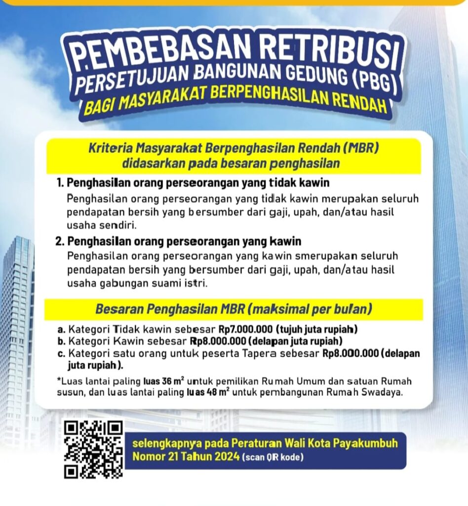 Pemerintah Kota Payakumbuh memberikan kemudahan bagi masyarakat melalui kebijakan pembebasan retribusi Persetujuan Bangunan Gedung (PBG) bagi masyarakat berpenghasilan rendah (MBR). Kebijakan ini merupakan bentuk dukungan pemerintah dalam membantu masyarakat untuk memperoleh legalitas bangunan secara resmi tanpa terbebani biaya retribusi.