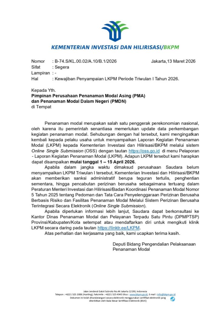 Adapun periode penyampaian LKPM Triwulan I Tahun 2026 dilaksanakan pada tanggal 1 sampai dengan 15 April 2026. Oleh karena itu, seluruh pelaku usaha yang termasuk dalam kategori tersebut diharapkan dapat memenuhi kewajiban pelaporan tepat waktu guna mendukung akurasi data dan efektivitas pengawasan investasi.